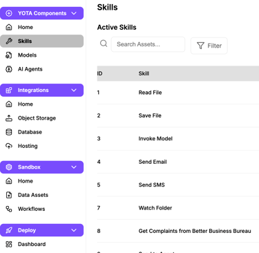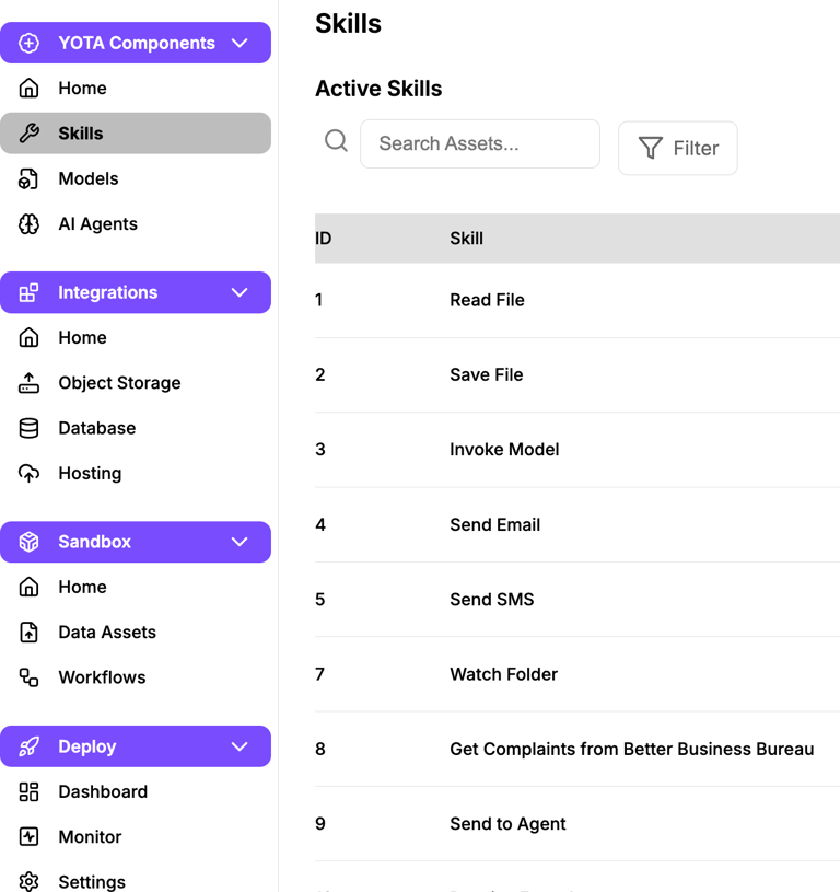 Out of the box Skills with the ability to add custom skills; automatic creation of new skills